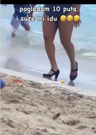 Video snimljen na plaži sada je popularan na društvenim mrežama, a žena koja ga je snimila prikupila je milijun pratitelja. Umjesto da odabere posebne vodene cipele, zadržala je svoj osobni stil. Nosila je visoke pete i plutala u njima. Mnogi su se usredotočili na žensko kretanje po plaži nakon izlaska iz vode, što je dovelo do jednostavnog dogovora.